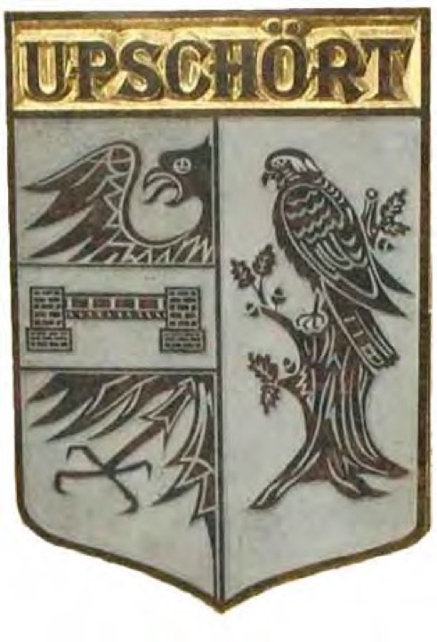 Das Wappen von Upschört. Es symbolisiert mit dem Halbadler die Zugehörigkeit zu Ostfriesland und mit der Brücke den Ems‐Jade‐Kanal. Der Falke auf einer Mooreiche symbolisiert das Upschörter Moor, das der Kolonie ihren Namen gab. Das Wappen wurde anlässlich der 200‐Jahr‐Feier von Upschört von Dietrich Fischer entworfen. Der Wappenstein befindet sich am Auricher Weg 41.