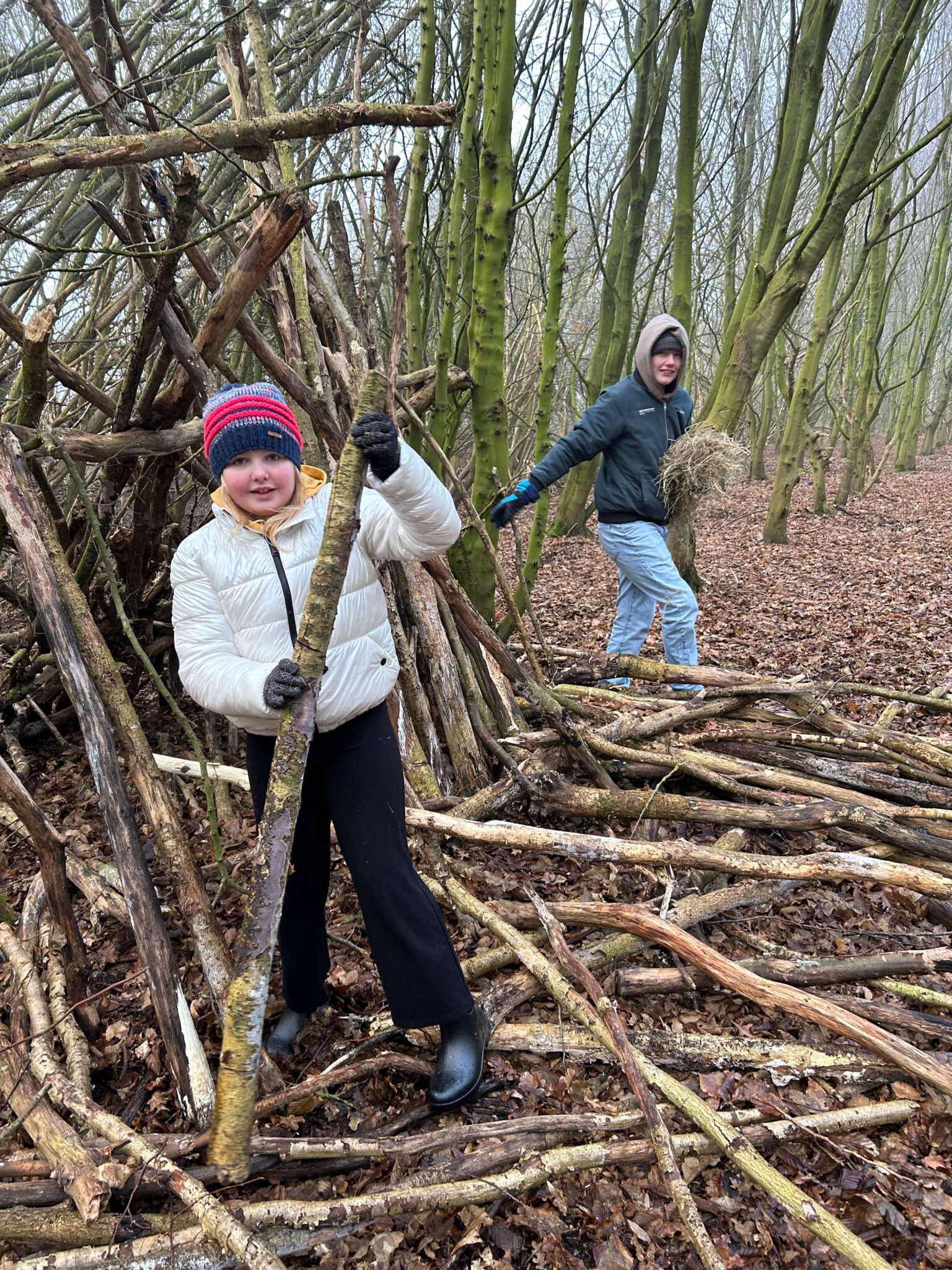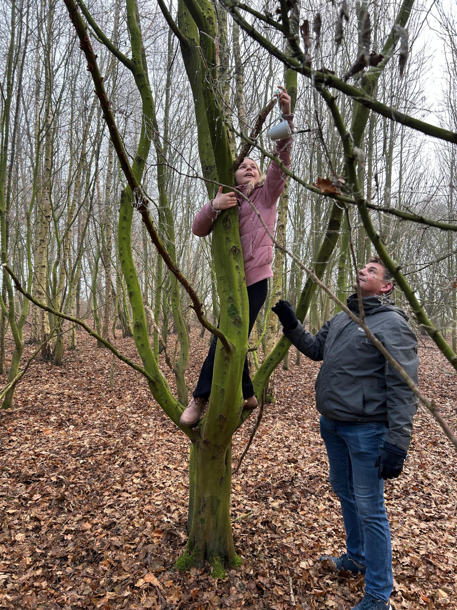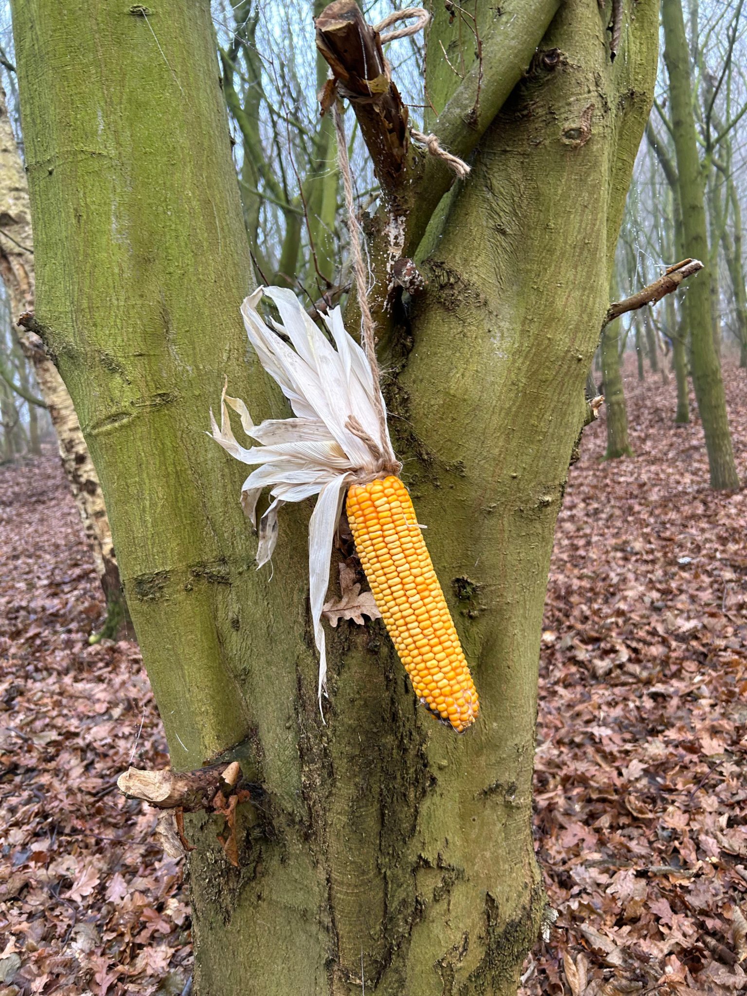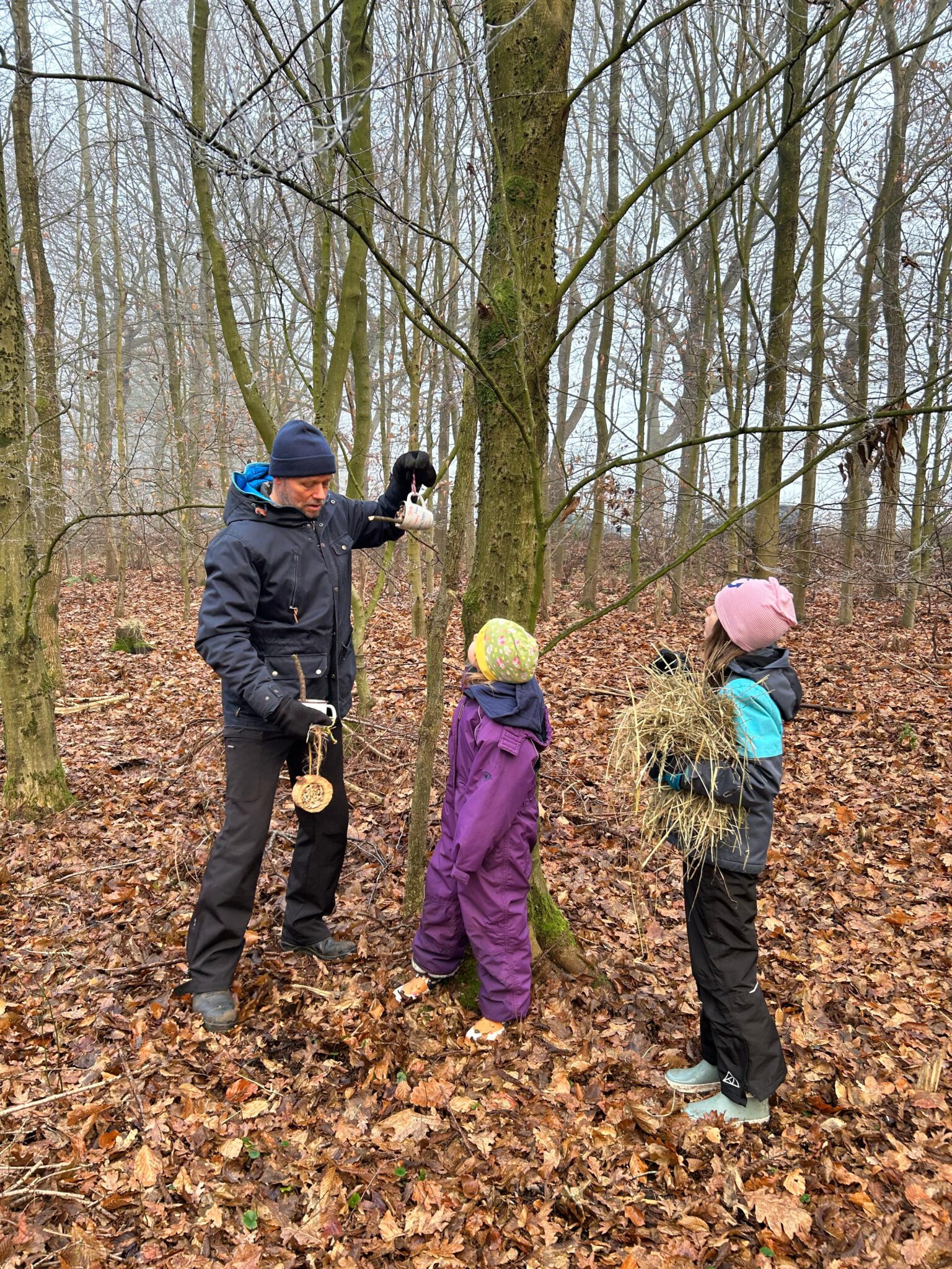 Alle gemeinsam gingen dann mit den Futtergaben und Leckereien für die Wildtiere los, um sie im schönen Eichen- und Buchenwald zu verteilen. Futterglocken wurden aufgehängt und Heu kam an trockene Plätze an Baumstümpfen. Vielleicht wird ein Reh oder ein Hase hier bald ein warmes Lager finden, oder das Heu auch gern fressen. Der Fantasie der Waldinteressierten waren da keine Grenzen gesetzt.