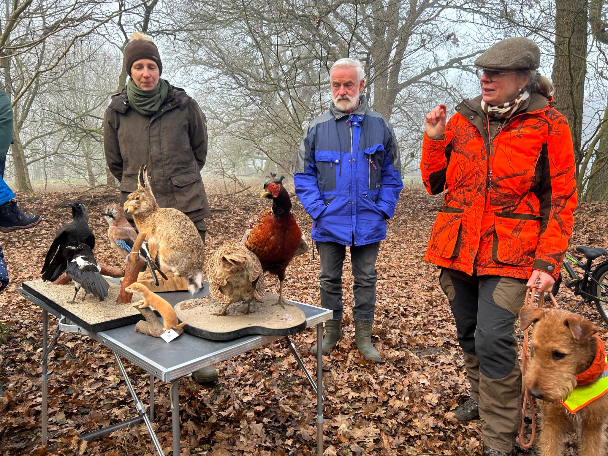 Ein Magnet an der Sitzgruppe vor dem „Wysder Holt“ waren besonders für die Kinder Präparate heimischer Wildtiere. Ein Fasanenpärchen, ein Hase, eine Krähe, ein Eichelhäher, eine Elster und besonders das Mauswiesel begeisterten die Jüngsten. Jägerinnen und ein Förster erzählten dem interessierten Publikum viel über die Geschichte des Waldes und die hier lebende Tierwelt. Viele der anwesenden Kinder wussten gut Bescheid, dass Vögel, Hasen, Rehe, Füchse und Wildschweine hier zu Hause sind, oder dass sie als Besucher im „Wysder Holt“ vorbeikommen.